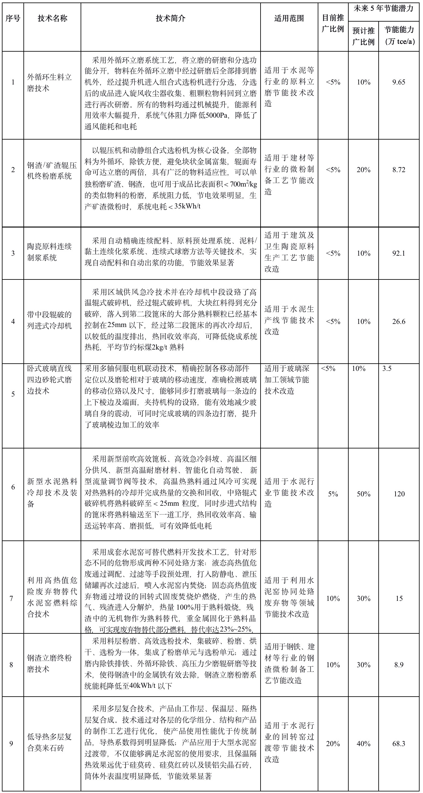 本次公示的工業節能技術目錄按技術類別劃分為流程工業節能改造技術、余熱余壓節能改造技術、重點用能設備系統節能技術、能源信息化管控技術、其他工業節能技術等大類。建材行業水泥、玻璃、陶瓷、耐火材料等領域有多項技術入圍推薦目錄(清單見下表)。