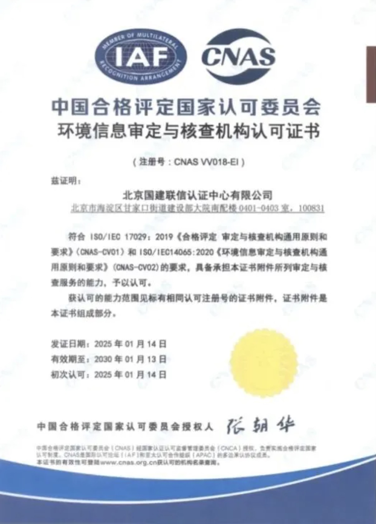 2025年1月14日,北京國建聯信認證中心有限公司(簡稱“國建認證”)順利獲批中國合格評定國家認可委員會(CNAS)審定與核查門類溫室氣體審定與核查分項制度認可資質(注冊號:CNAS VV018-EI),這標志著國建認證在溫室氣體審定與核查領域的專業能力和技術水平得到了國家權威機構的高度認可。