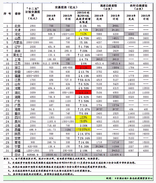 一張表讀出全國各地2015年交通建設(shè)投資情況