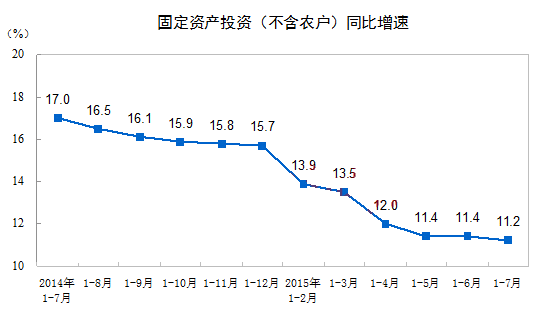 2015年1-7月份,全國固定資產投資(不含農戶)288,469億元,同比名義增長11.2%,增速比1-6月份回落0.2個百分點。從環比看,7月份固定資產投資(不含農戶)增長0.75%。