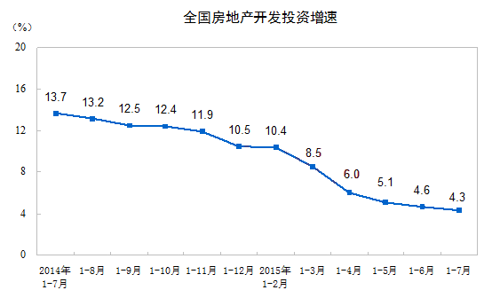 2015年1-7月份,全國房地產開發投資52,562億元,同比名義增長4.3%,增速比1-6月份回落0.3個百分點。其中,住宅投資35,380億元,增長3.0%,增速提高0.2個百分點。住宅投資占房地產開發投資的比重為67.3%。