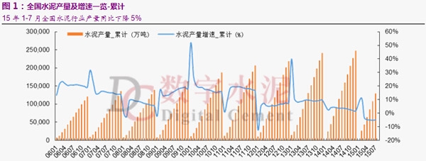 2015年1-7月我國水泥行業產量12.9億噸,同比下降5%;2015年7月我國水泥行業產量2.1億噸,同比下降4.7%,環比下降2.7%。2015年1-7月累計增速較1-6月回升0.3個百分點,降幅收窄,但當前水泥行業整體需求仍舊疲弱。