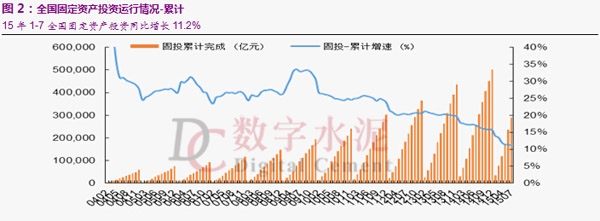 2015年1-7月我國城鎮固定資產投資28.8萬億元,增速11.2%,增速較2014年同期下降5.8個百分點,較1-6月下降0.2個百分點;2015年7月我國城鎮固定資產投資5.1萬億元,增速9.9%,增速較2014年同期下降5.8個百分點;