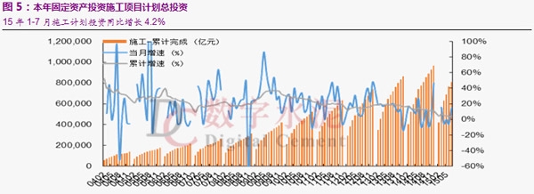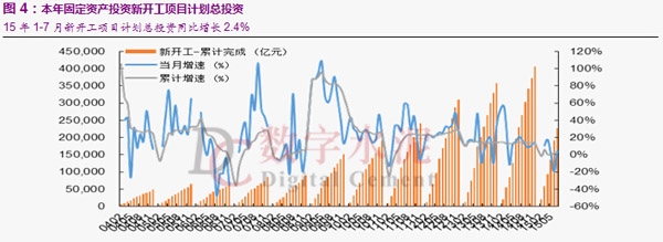 2015年1-7月新開工項目計劃總投資22.7萬億元,增速2.4%,增速較2014年同期下降12.2個百分點,單7月新開工項目計劃總投資同比增速4.8%;施工項目計劃總投資80.7萬億元,增速4.2%,增速水平較2014年同期下降8.9個百分點,單7月施工項目計劃總投資同比增速14.8%;