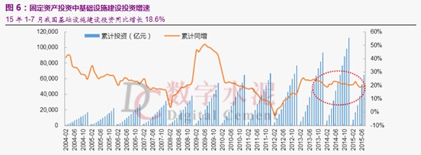 2015年1-7月我國基礎設施建設投資6.5萬億元,增速18.6%; 2012年下半年至今一直作為“穩增長”引擎。
