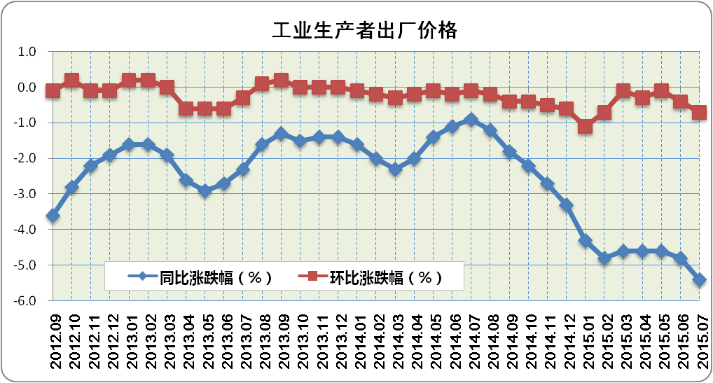2015 年 7 月份,全國(guó)工業(yè)生產(chǎn)者出廠價(jià)格環(huán)比下降 0.7% ,同比下降 5.4% 。工業(yè)生產(chǎn)者購(gòu)進(jìn)價(jià)格環(huán)比下降 0.6% ,同比下降 6.1% 。 1-7 月平均,工業(yè)生產(chǎn)者出廠價(jià)格同比下降 4.7% ,工業(yè)生產(chǎn)者購(gòu)進(jìn)價(jià)格同比下降 5.6% 。