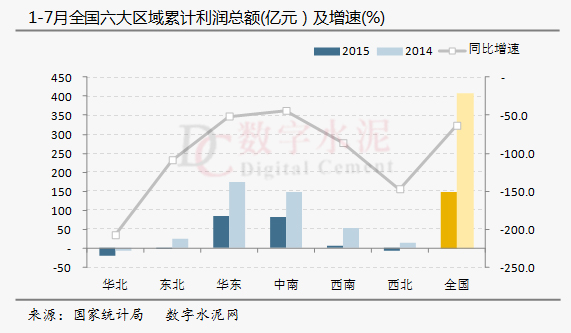投資增長放緩,水泥需求疲軟,市場競爭加劇,價格持續下滑,導致水泥行業盈利能力不斷下降,7月份盈利狀況并不樂觀。根據國家統計局的數據顯示,1-7月份,全國水泥行業累計實現利潤總額147億元,較去年同期減少260億元,同比下滑約64%,去年同期為406.7億元。7月份全國單月利潤總額14.19億元,環比減少63.45%。從全國六大區域水泥市場來看,前7個月南方區域繼續保持盈利,北方區域仍然全部虧損。7月份,華北和西南地區由上月的單月盈利轉為虧損狀態,其他地區利潤總額均為正值。