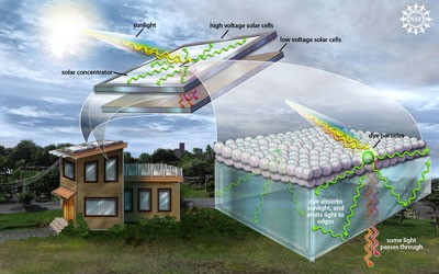 “這項新興技術是將一部分透射光分散在玻璃窗上,被納米粒子(半導體量子點)吸收,然后重新發射出肉眼看不見的紅外波長,再被傳導到窗戶邊框上的太陽能電池上。”洛斯阿拉莫斯國家實驗室首席研究員維克多·克里莫夫說。