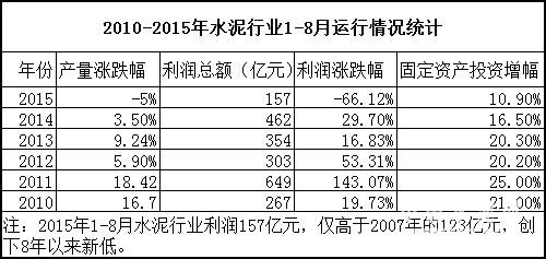 ??在固定資產投資方面,同樣不容樂觀。數據顯示,2013-2015年1-8月國內固定資產投資增速分別為20.3%、16.5%和10.9%,即3年之內1-8月國內固定資產投資增速便實現了腰斬。由此可見,當前水泥行業不但利潤低,后期形勢同樣不容樂觀。預計今年,水泥行業利潤恐創下近年新低,產量將下滑5%左右。