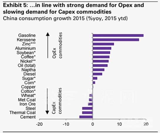 ??調查顯示,今年迄今,中國對資本支出相關原物料的需求逐漸萎縮,對營運開支相關原物料的需求卻日益增加。舉例來說,水泥的需求量較去年同期萎縮 5%,但汽油需求卻年增了19.1%之多,而咖啡的消耗量也有增加趨勢。