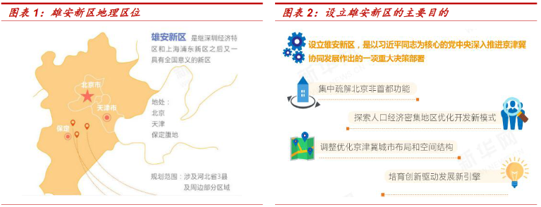 事件:中共中央國務院印發通知,決定設立河北雄安新區,定位為深圳經濟特區和浦東新區后具有全國意義的新區,是“千年大計,國家大事”。雄安新區的設立起步面積約為 100 平方公里,中期發展區域面積約為 200 平方公里,遠期控制區面積為 2000 平方公里。主要目的是集中疏解北京非首都功能,探索人口經濟密集地區優化開發新模式,調整優化京津冀城市布局和空間結構,培育創新驅動發展新引擎。