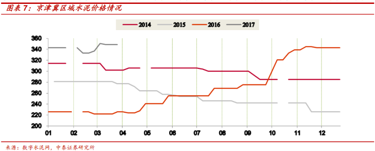 ![]() 從價格角度看,華北區域水泥價格隨著區域內供需格局的改善,2016年年中開始出現明顯提升。4月2日開始,華北水泥價格再漲50元/噸,為全年盈利大幅好轉奠定堅實基礎。