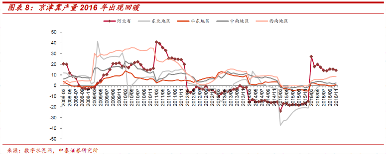 ![]() 從產量角度看,京津冀地區水泥產量(以河北為主)在2016年出現了明顯回暖趨勢。我們認為隨著京津冀一體化的不斷推進,區域內水泥總體需求仍能維持穩定增長。