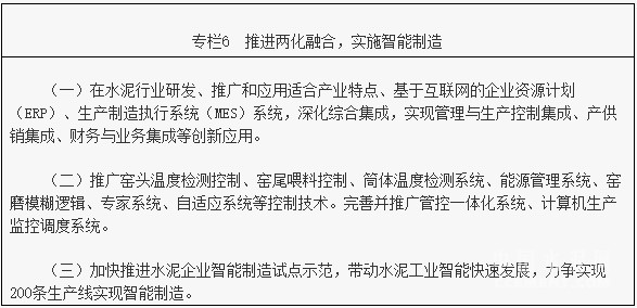貫徹落實《中國制造2015》,通過政策引導和鼓勵,進一步加快推動水泥行業兩化融合工作,提升水平全面推廣,實現智能制造、控制、管理。
