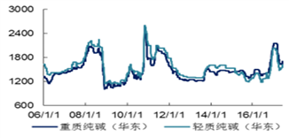 圖8 國(guó)內(nèi)輕、重質(zhì)純堿價(jià)格(元/噸)