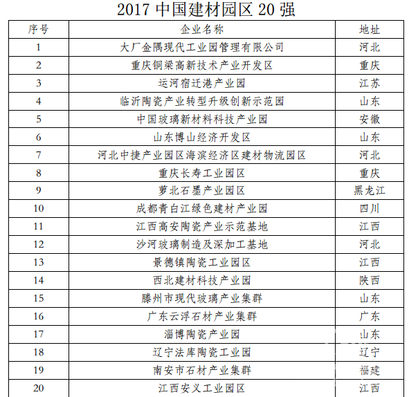 2017中國建材園區20強榜單