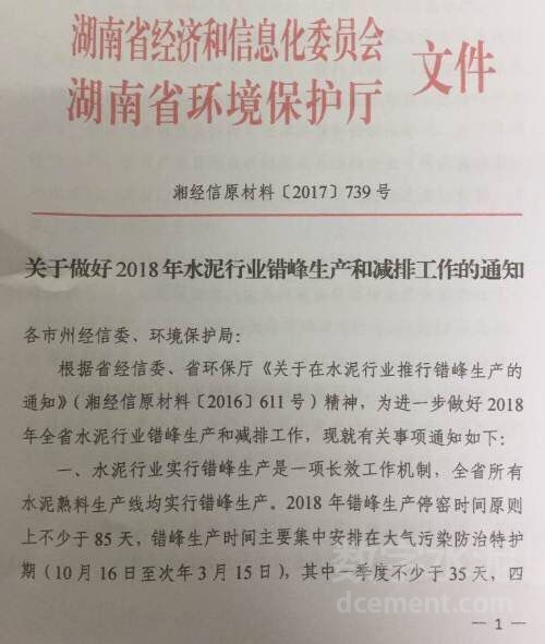 全省所有水泥熟料生產線均實行錯峰生產,2018年錯峰停窯時間原則上不少于85天。 |