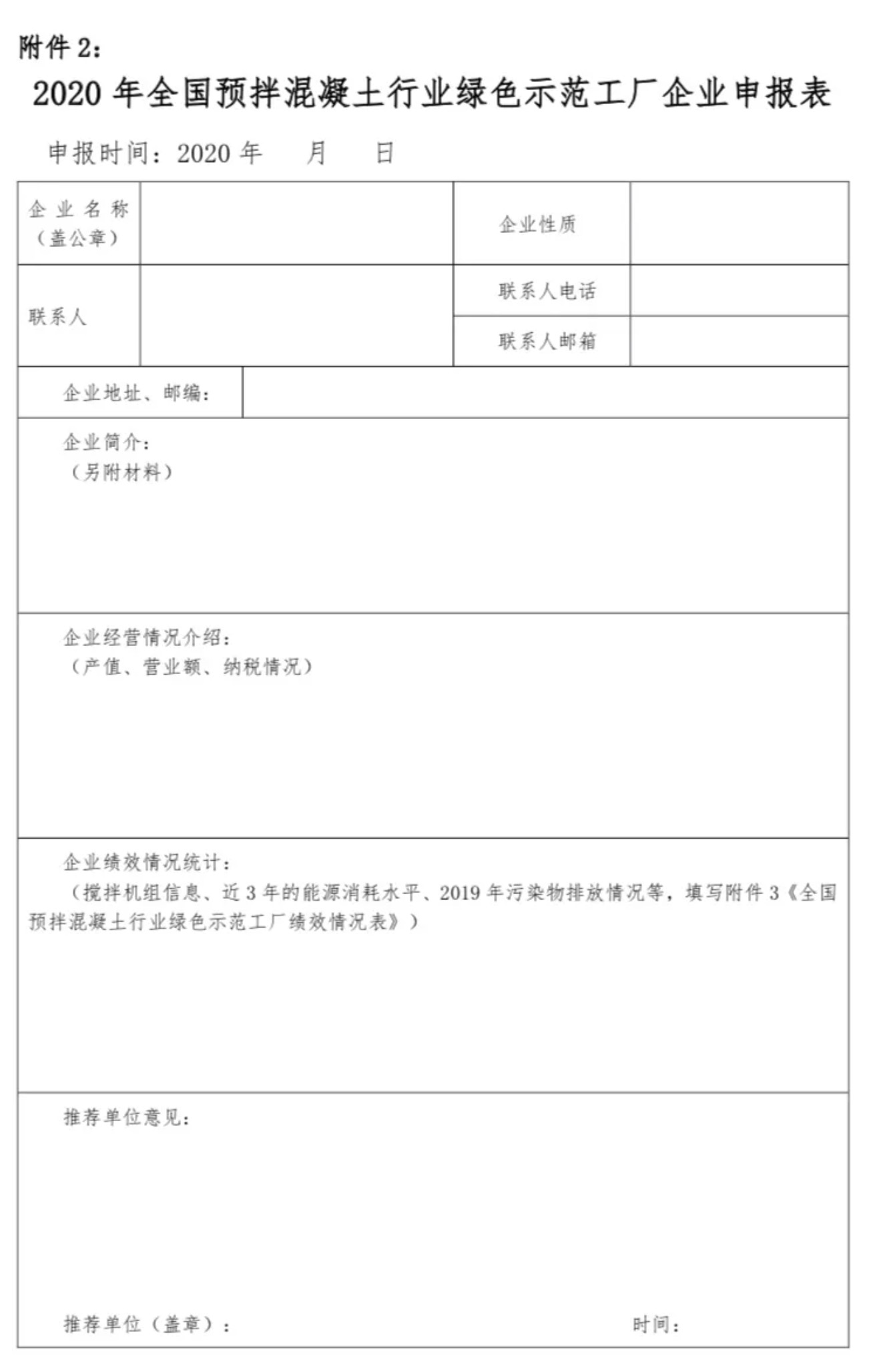 第九條 全國預拌混凝土行業綠色示范工廠的申報采取企業自愿申報與省市相關行業協會推薦相結合的方式進行。第十條 申報時須填寫統一格式的《2020年全國預拌混凝土行業綠色示范工廠企業申報表》,按照“全國預拌混凝土行業綠色示范工廠評價指標體系表(2020)”提供必要的證明和評價材料(電子版)。《2020年全國預拌混凝土行業綠色示范工廠企業申報表》及相關材料應當完整、真實、可靠。