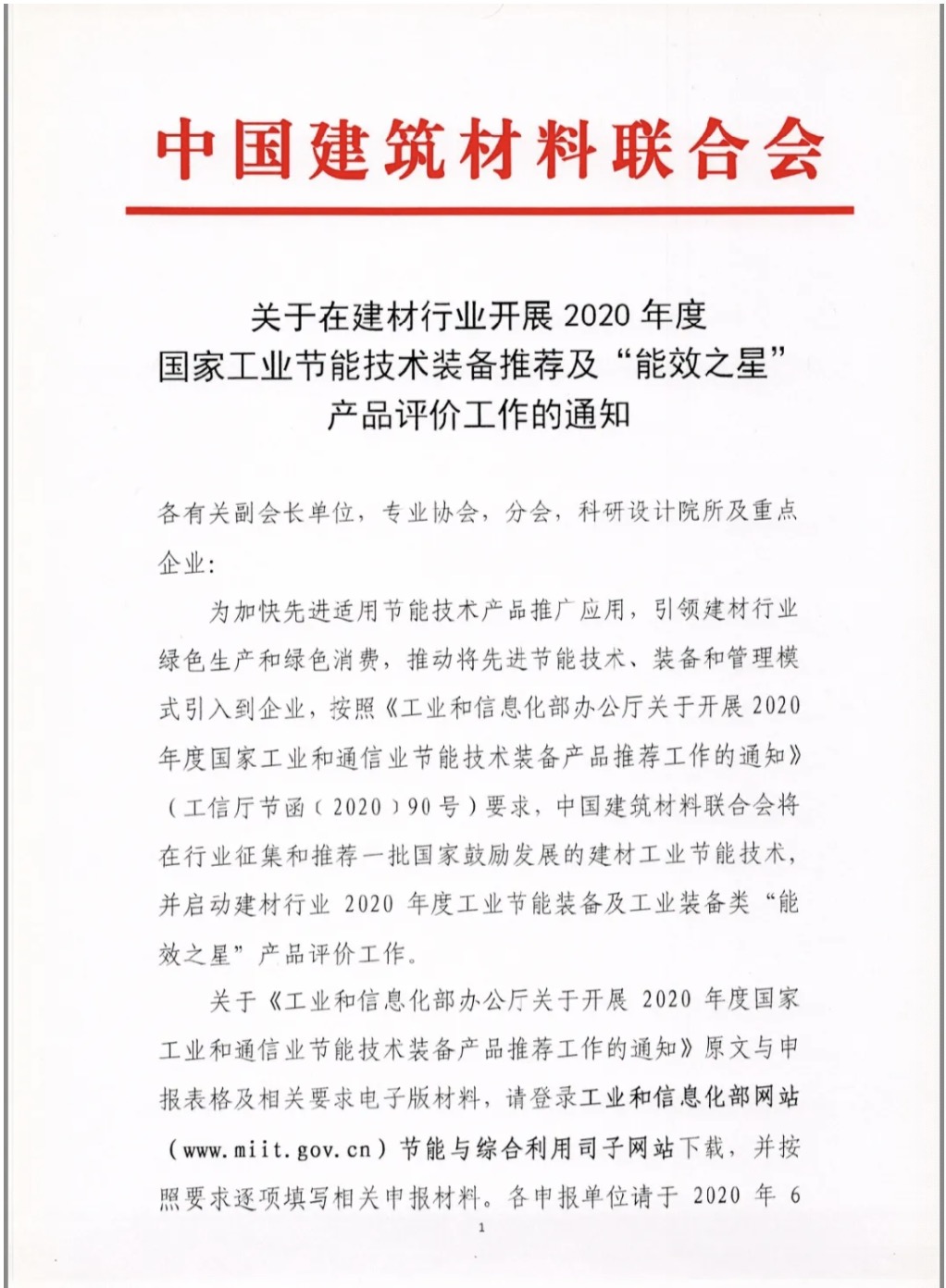 建材行業(yè)開展2020年度國(guó)家工業(yè)節(jié)能技術(shù)裝備推薦及“能效之星” 產(chǎn)品評(píng)價(jià)工作