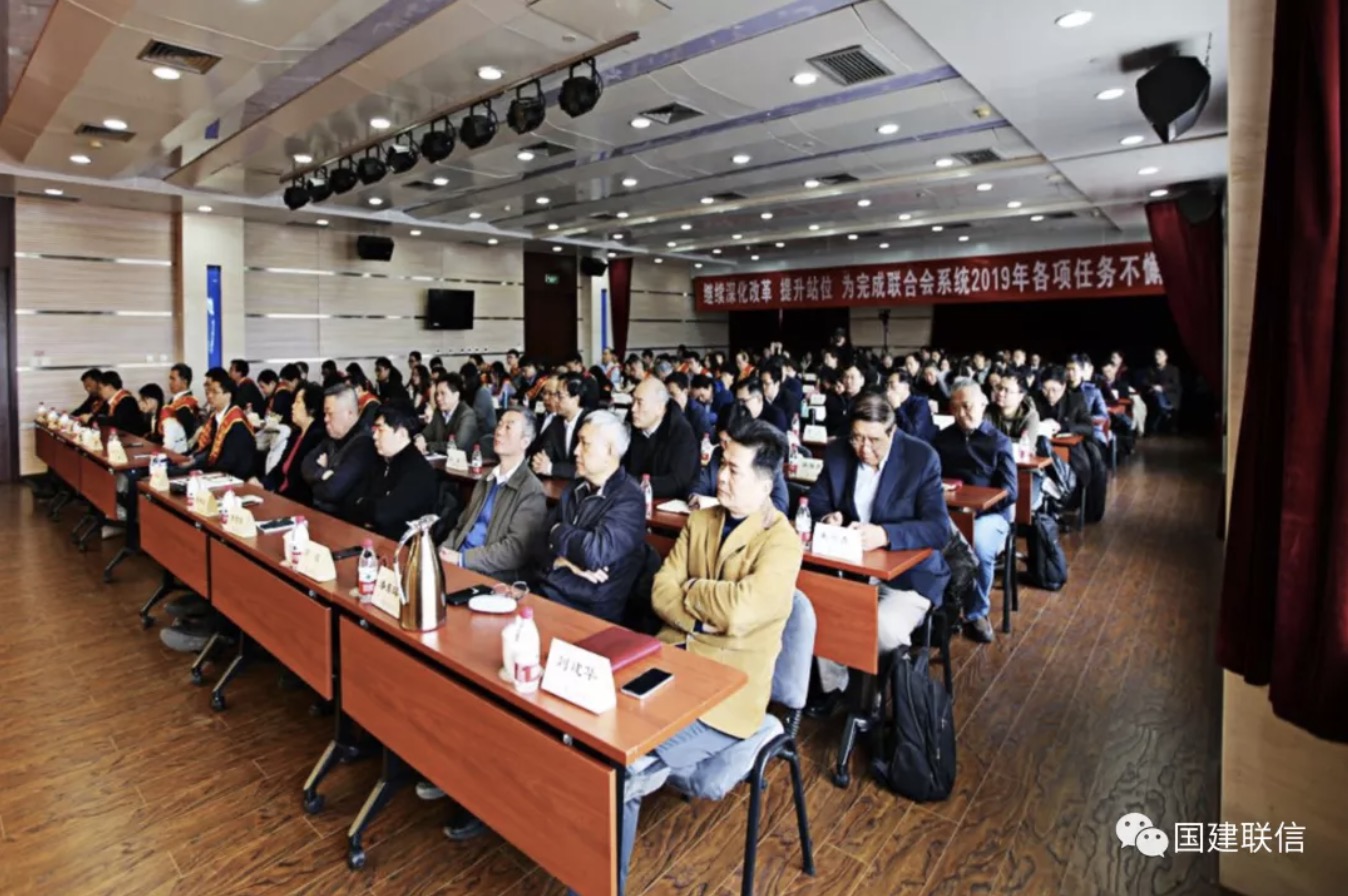 中國建筑材料聯合會2018年度工作總結先進表彰大會在雄壯的國歌聲中召開。會場后方上懸掛的橫幅--繼續深化改革 提升站位 為完成聯合會系統2019年各項任務不懈奮斗。