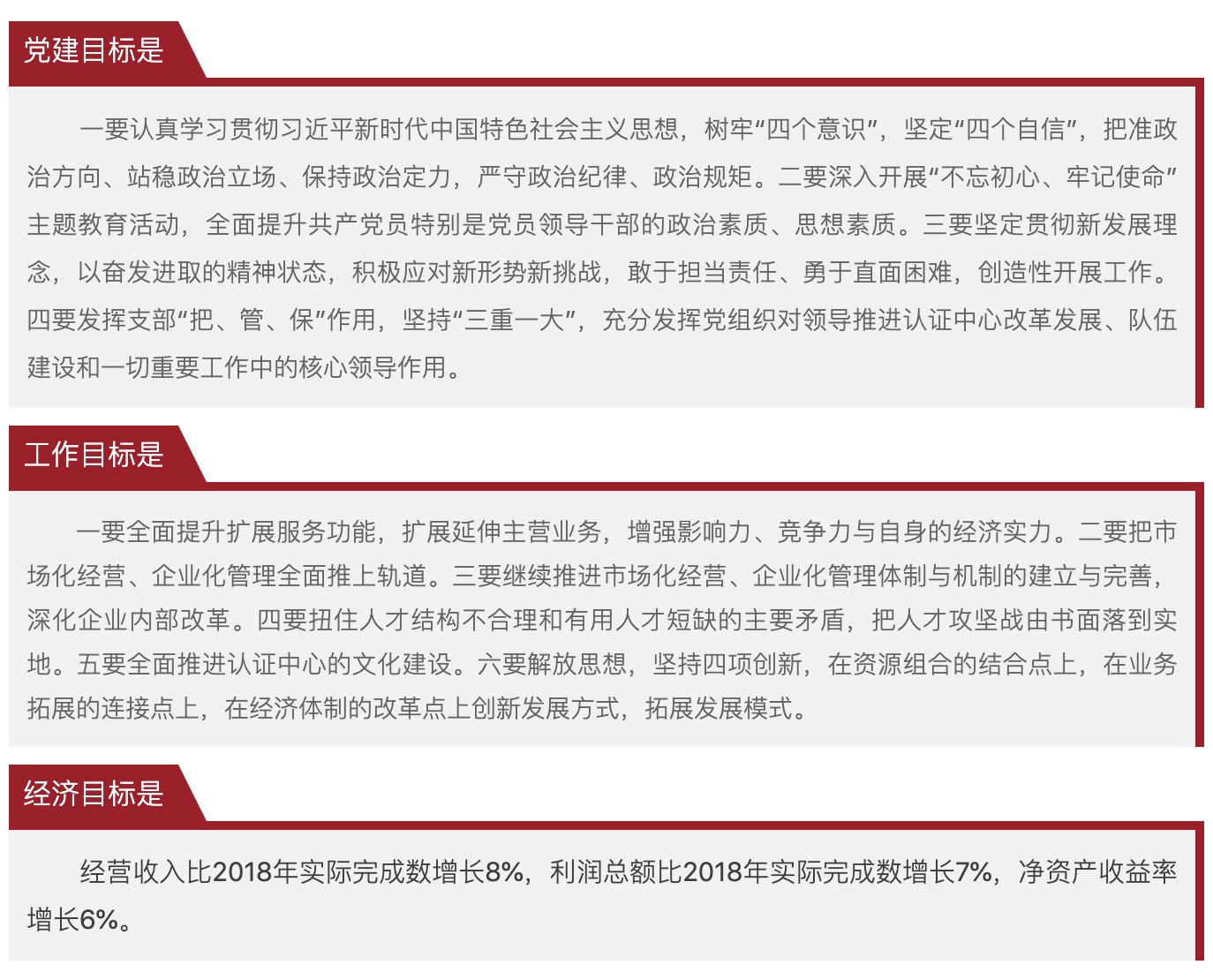 2019年是認證中心實現三年目標的關鍵之年,認證中心將在中國建筑材料聯合會的領導下,堅定“四個自信”,牢固樹立“四個意識”,踐行“兩個維護”,全面貫徹落實黨的十九大精神,認真學習和落實新時代的內涵,將政治站位,思想定位,目標定位與黨中央保持高度一致,以黨的政治建設為統領,切實加強黨的建設、業務建設、制度建設、人才建設和文化建設工作。堅持執行建材聯合會“引領、協調、服務”的發展宗旨和定位,按照“中建材聯綜發〔2019〕25號”文件精神要求,緊緊圍繞聯合會系統2019年制訂目標的“12項重點工作”,包括直屬單位的六項重點任務,按照中心三年發展目標及“345工程”建設思想,創新思維方式、創新領導方法和工作方法、創新發展模式和體制機制,立足認證中心的主營工作,拓展業務橫向功能,延伸業務縱向產業鏈,推進企業化管理。認證中心全體職工將堅定信心、勇于擔當,繼續推進認證中心改革和發展,堅持服務為本、質量第一、效益優先。