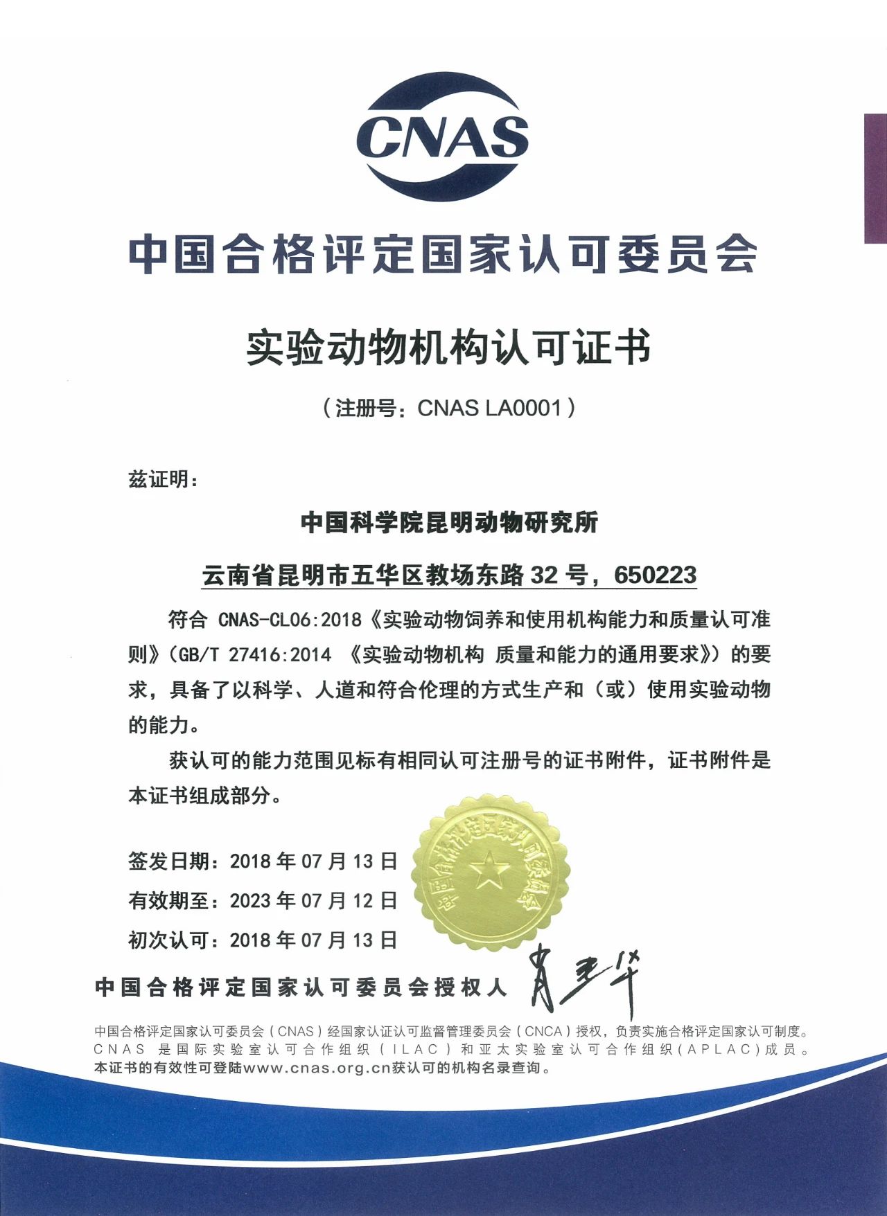 2018年7月13日,中國合格評定國家認可委員會(CNAS)為中國科學院昆明動物研究所(以下簡稱昆明動物研究所)頒發(fā)了我國第一張實驗動物機構認可證書。這標志著我國自主研發(fā)、創(chuàng)新建立的實驗動物機構認可制度正式實施。