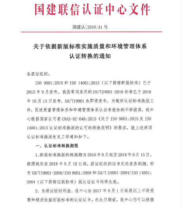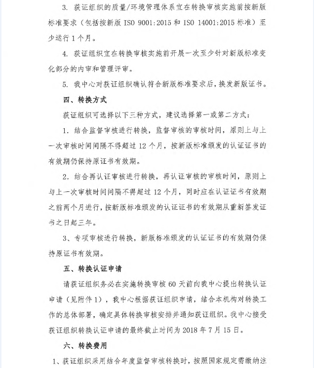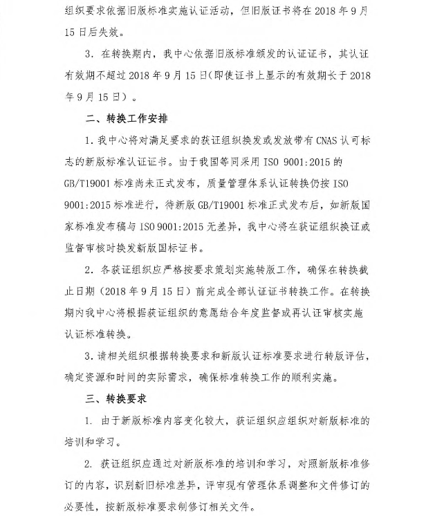 關于依據新版標準實施質量和環境管理體系認證轉換的通知