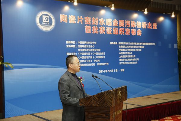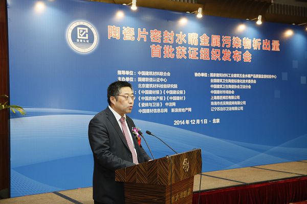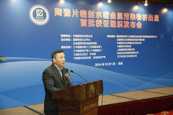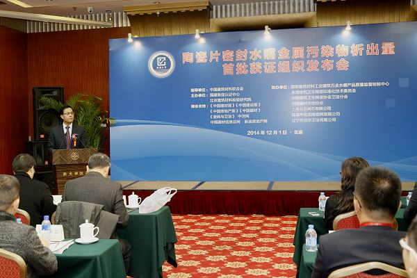 由我中心舉辦的《陶瓷片密封水嘴金屬污染物析出量首批獲證組織發布會》于2014年12月1日在京召開。中國建筑材料聯合會徐永模副會長就建材行業轉型發展,由“跟隨追趕”向“超越引領”跨越發表了重要講話,同時對陶瓷片密封水嘴金屬污染物析出量認證工作給予了充分肯定。國家認證認可監督管理委員會認證監管部主任薄昱民、國家標準化管理委員會工業一部副主任肖寒、全國建筑衛生陶瓷標準化技術委員會秘書長 王博出席會議并講話。國建聯信認證中心武慶濤總經理宣布了陶瓷片密封水嘴金屬污染物析量首批獲證組織名單。中宇建材集團有限公司等29家單位首批獲得陶瓷片密封水嘴金屬污染物析出量認證。會議由國建聯信認證中心韓光輝常務總經理主持,北京建筑材料檢驗研究院有限公司王肇嘉總經理致辭。中國建筑衛生陶瓷協會衛浴分會、中國建材市場協會、29家單位首批陶瓷片密封水嘴金屬污染物析出量認證獲證企業的代表、《中國建材報》、《中國建材》雜志社、《中國建設報》、《中國房地產報》、《京華時報》、《瓷磚與衛浴》、《中潔網》、《新浪房地產網》、《中國建材信息總網》等70余名代表參加了會議。
