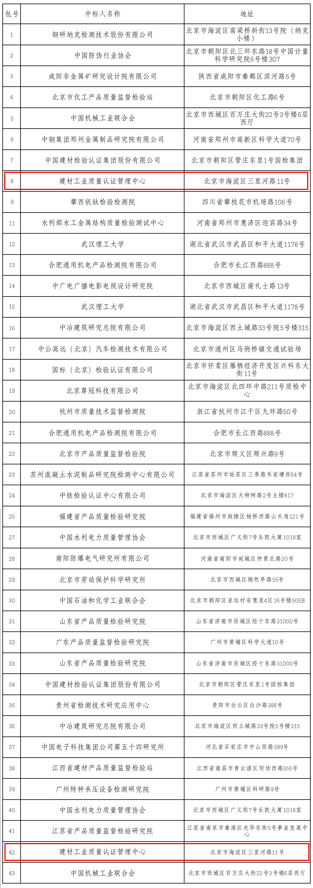 2020年7月31日,中國政府采購網中國政府購買服務信息平臺公布了“國家市場監督管理總局產品質量安全風險監測站建設工作項目(第一批)中標公告”,建材工業質量認證管理中心分別中標“建筑防水卷材產品”、“砂石產品”兩個項目。