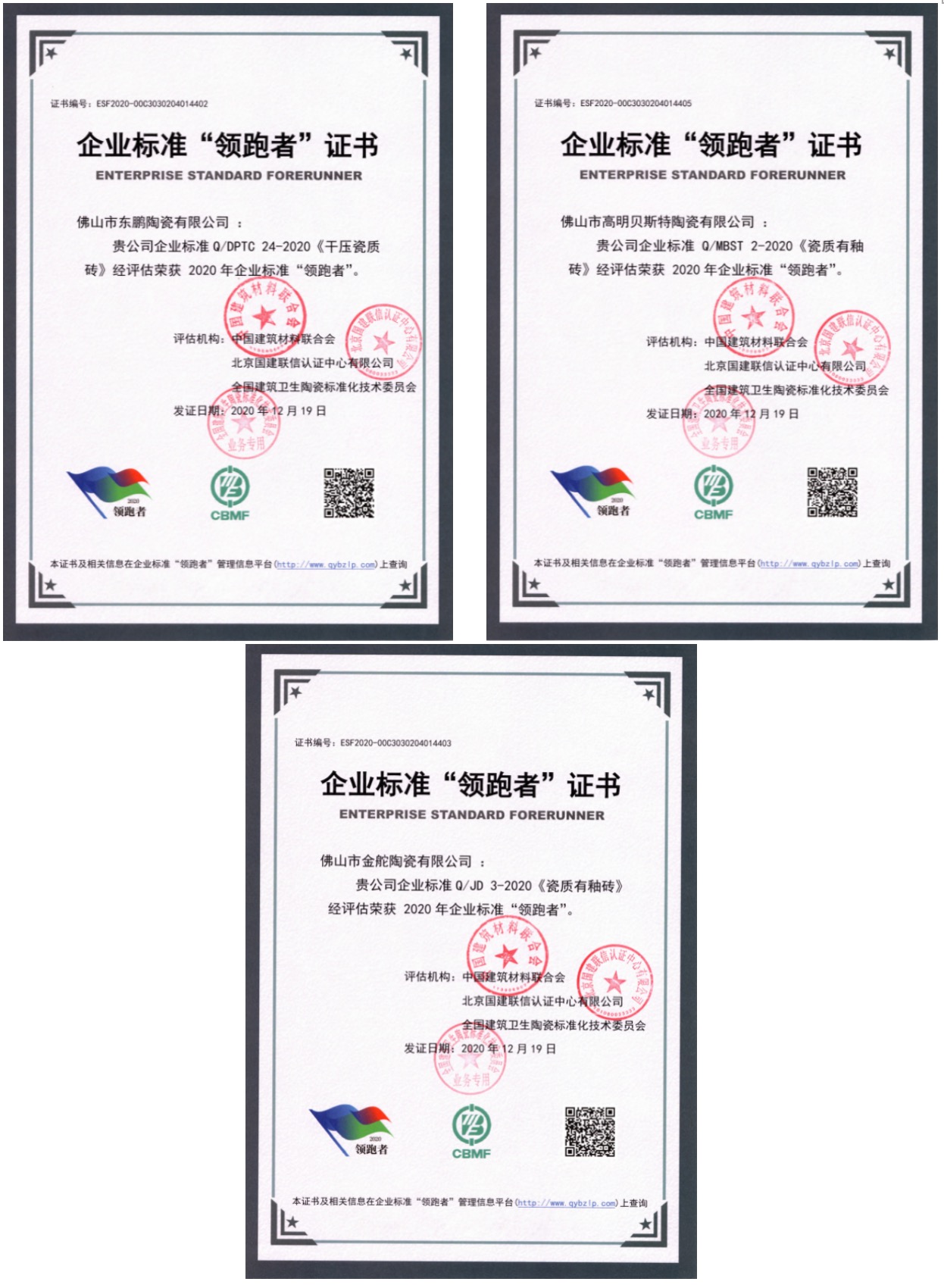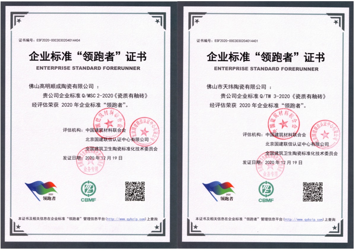 陶瓷磚(板)行業榮獲2020年第一批企業標準“領跑者”的標準分別為:Q/DPTC 24-2020《干壓瓷質磚》、Q/MBST 2-2020《瓷質有釉磚》、Q/JD 3-2020《瓷質有釉磚》、Q/MSC 2-2020《瓷質有釉磚》和Q/TW 3-2020《瓷質有釉磚》。