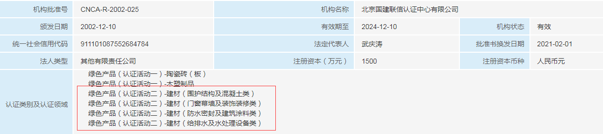 2021年2月1日,北京國建聯信認證中心有限公司(簡稱國建認證)率先獲批綠色建材產品認證機構資質,成為國內首家綠色建材產品認證機構。認證領域包括圍護結構及混凝土類、門窗幕墻及裝飾裝修類、防水密封及建筑涂料類、給排水及水處理設備類四個大類。產品種類涉及34種建材產品,具體為:預制構件、鋼結構房屋用鋼構件、現代木結構用材、砌體材料、保溫系統材料、預拌混凝土、預拌砂漿、混凝土外加劑減水劑、建筑門窗及配件、建筑幕墻、建筑節能玻璃、建筑遮陽產品、門窗幕墻用型材、鋼質戶門、金屬復合裝飾材料、建筑陶瓷、衛生潔具、無機裝飾板材、石膏裝飾材料、石材、鎂質裝飾材料、吊頂系統、集成墻面、紙面石膏板、建筑密封膠、防水卷材、防水涂料、墻面涂料、反射隔熱涂料、空氣凈化材料、樹脂地坪材料、水嘴、建筑用閥門、塑料管材管件。