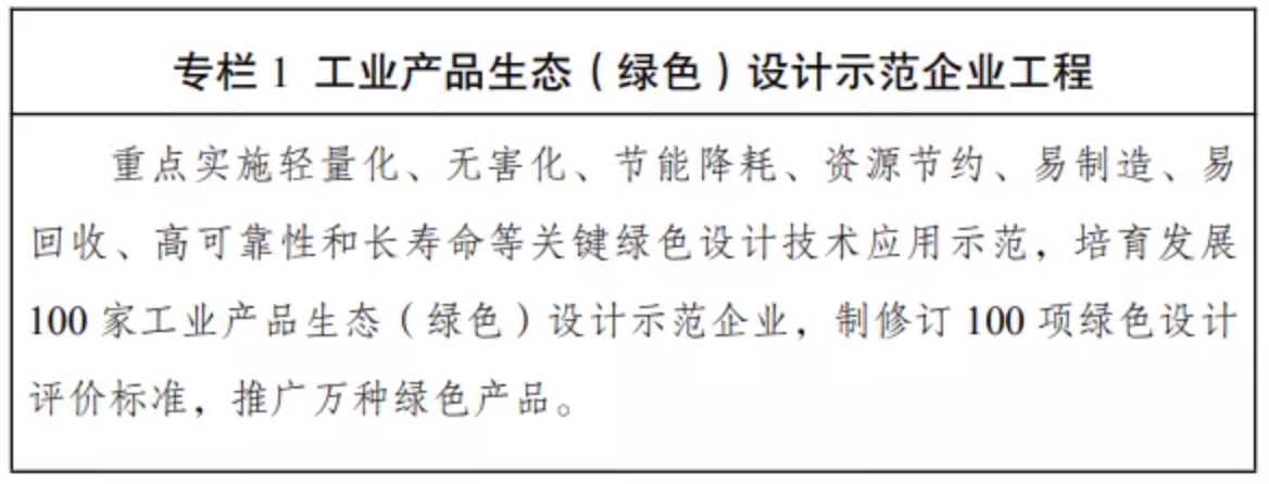 (四)推行工業產品綠色設計。健全工業產品綠色設計推行機制。引導企業改進和優化產品和包裝物的設計方案,減少產品和包裝物在整個生命周期對環境的影響。在生態環境影響大、產品涉及面廣、行業關聯度高的行業,創建工業產品生態(綠色)設計示范企業,探索行業綠色設計路徑。健全綠色設計評價標準體系。鼓勵行業協會發布產品綠色設計指南,推廣綠色設計案例。