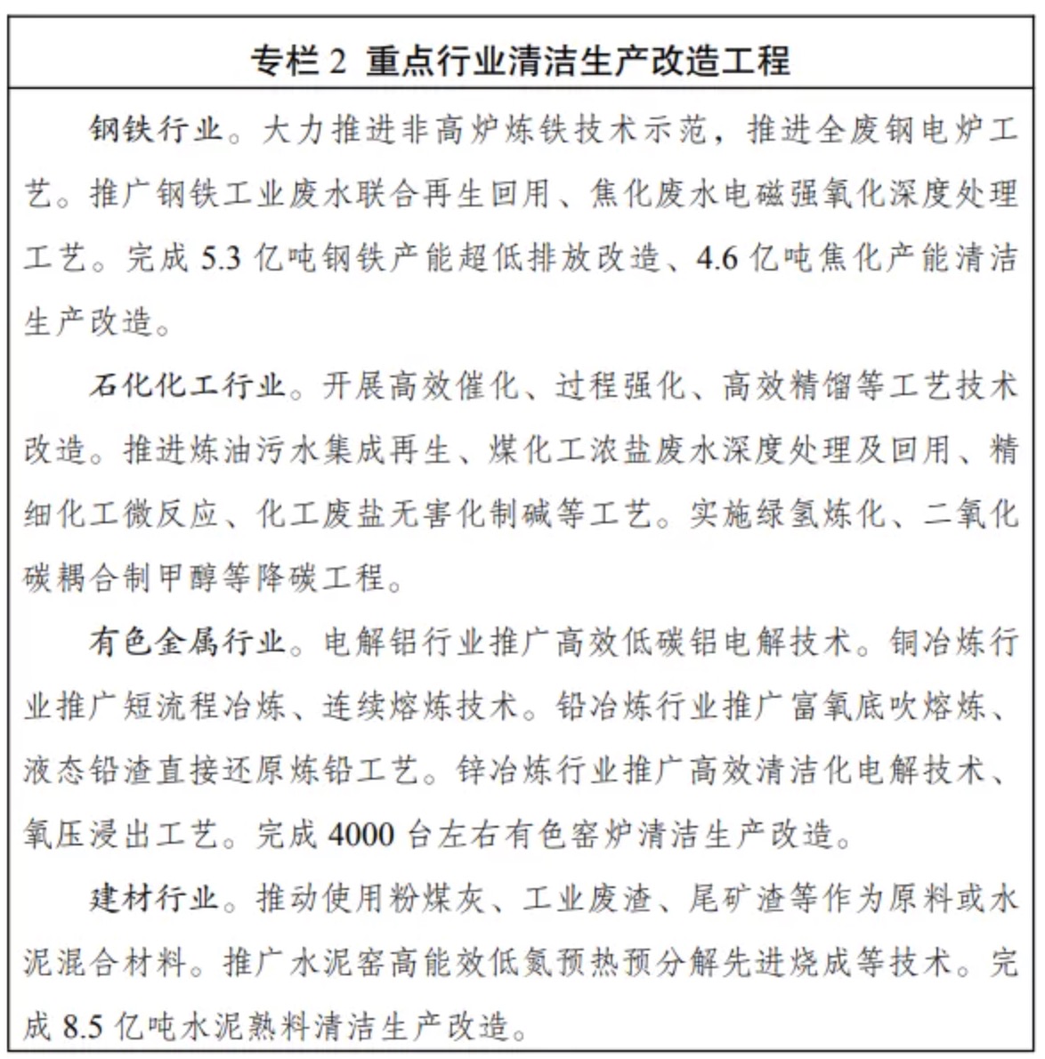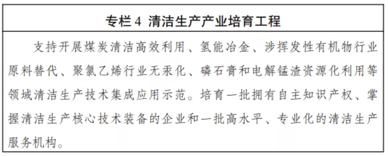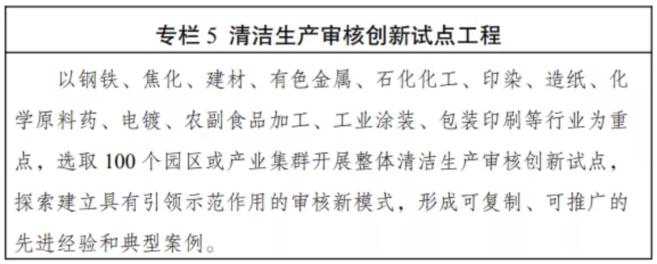 (六)大力推進重點行業清潔低碳改造。嚴格執行質量、環保、能耗、安全等法律法規標準,加快淘汰落后產能。全面開展清潔生產審核和評價認證,推動能源、鋼鐵、焦化、建材、有色金屬、石化化工、印染、造紙、化學原料藥、電鍍、農副食品加工、工業涂裝、包裝印刷等重點行業“一行一策”綠色轉型升級,加快存量企業及園區實施節能、節水、節材、減污、降碳等系統性清潔生產改造。在國家統一規劃的前提下,支持有條件的重點行業二氧化碳排放率先達峰。在鋼鐵、焦化、建材、有色金屬、石化化工等行業選擇100家企業實施清潔生產改造工程建設,推動一批重點企業達到國際清潔生產領先水平。