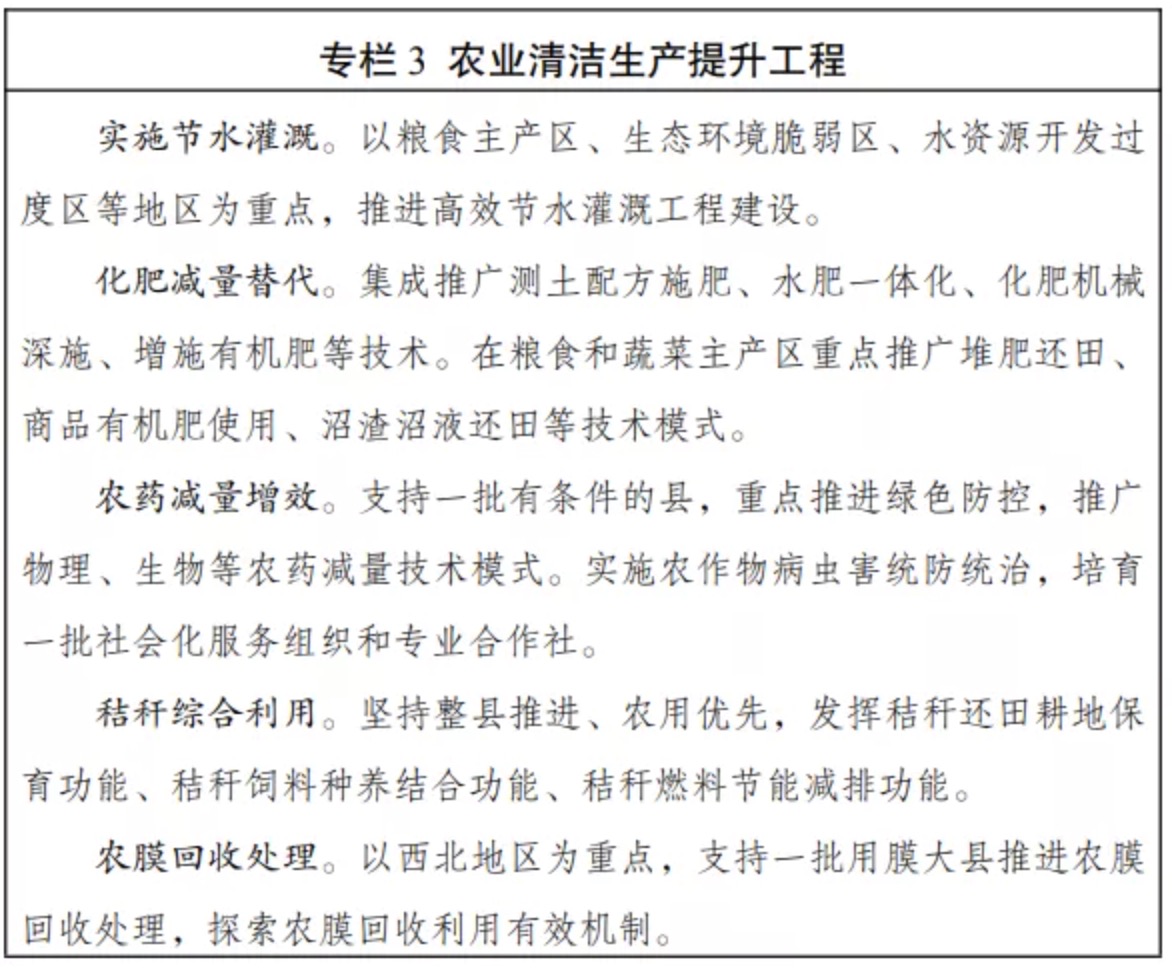 (九)加強農業廢棄物資源化利用。完善秸稈收儲運服務體系,積極推動秸稈綜合利用。加強農膜管理,推廣普及標準地膜,推動機械化撿拾、專業化回收和資源化利用,有效防治農田白色污染。因地制宜采取堆漚腐熟還田、生產有機肥、生產沼氣和生物天然氣等方式,加大畜禽糞污資源化利用力度。在糧食主產區、畜禽水產養殖優勢區、設施農業重點區和特色農產品生產區等農業廢棄物資源豐富區域,以及洞庭湖、丹江口水庫、太湖、烏梁素海等重點流域湖泊水庫周邊區域,深入推行農業清潔生產,形成一批可推廣、可復制的典型案例。
