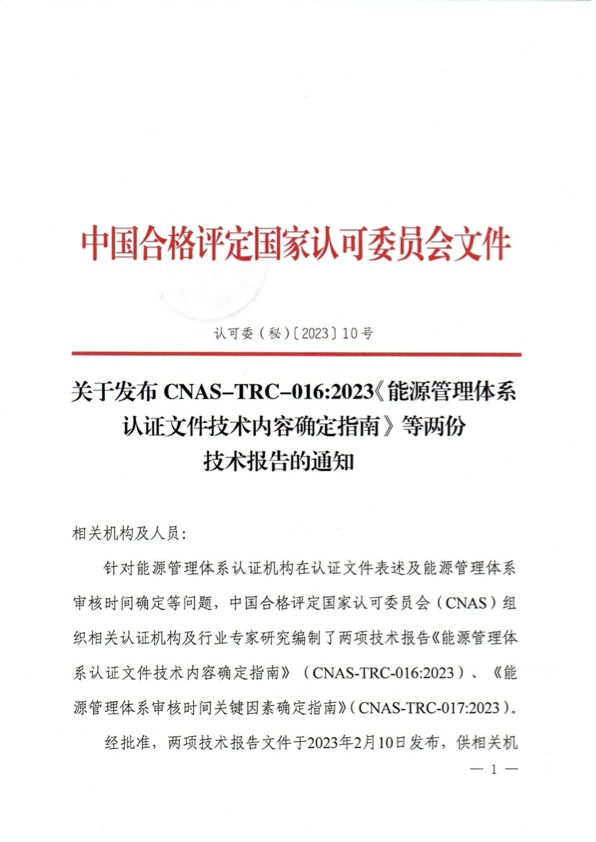 附件1:CNAS-TRC-016:2023《能源管理體系認證文件技術內容確定指南》