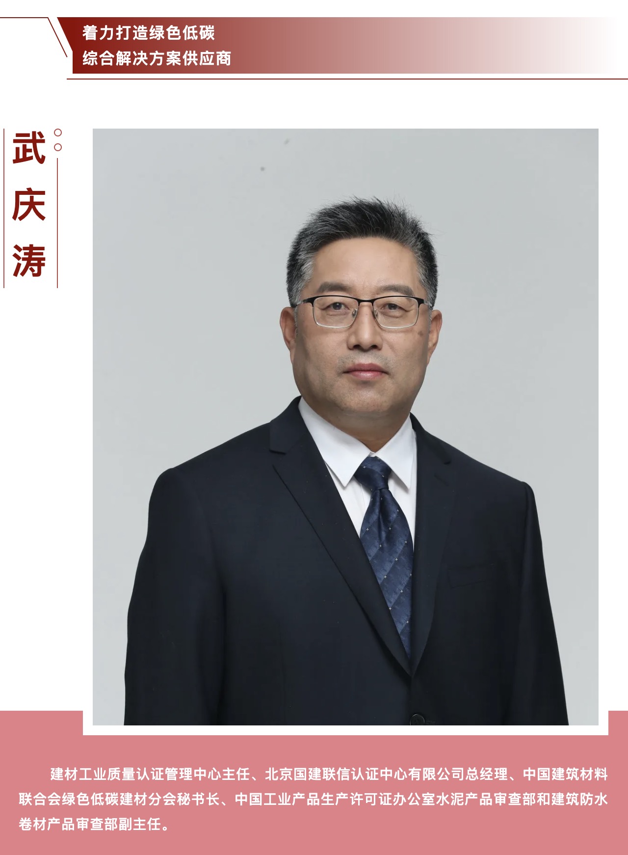 武慶濤長期從事建材行業(yè)管理體系和產品認證、評價及節(jié)能、低碳、綠色制造、生命周期、節(jié)水等方面課題研究和標準研制工作。為貫徹落實國家“雙碳”目標及“宜業(yè)尚品、造福人類”建材行業(yè)發(fā)展目標,他帶領國建認證努力提升科研能力及服務品質,堅持“兩翼發(fā)展、多輪驅動”新模式和“守護信任服務發(fā)展”新理念,逐步完成從傳統(tǒng)認證機構向綠色低碳綜合解決方案供應商的成功轉型。
